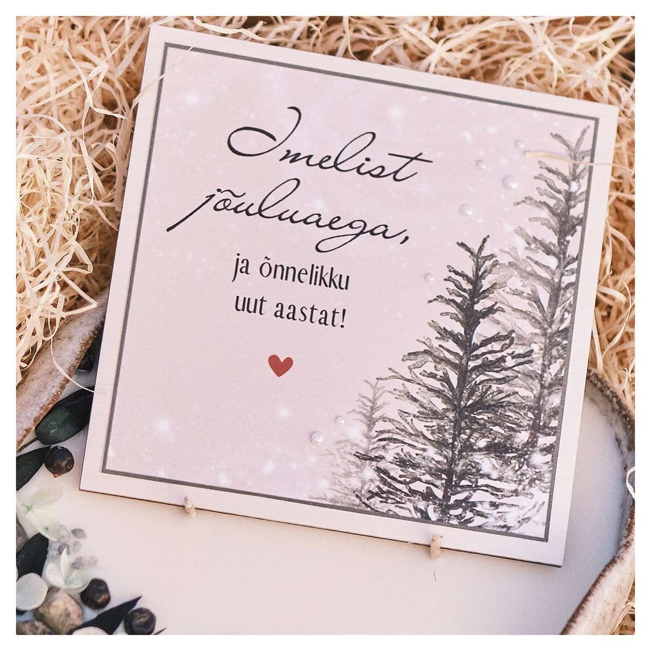 Kinkekomplekt – suur käsitöö sojavahast küünal koos elegantselt kujundatud puidust kaardiga. Kaardile saab graveerida ettevõtte logo ja lisada personaalse jõulusoovi.
