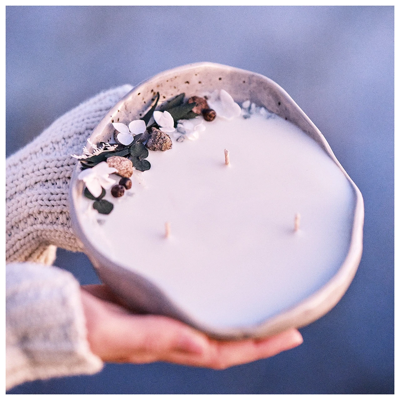 Küünal on kaunistatud stabiliseeritud hortensiaõite, eukalüptilehtedega– need on päris taimed, mille ilu ja värskus on spetsiaalse loodusliku töötluse abil säilitatud, et need püsiksid kaunid aastaid. Lisaks on veel kaunistuses kadakamarju ja kivikesi.