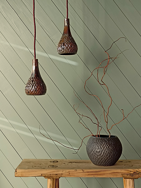 Keraamiline vaas, mis on glasuuritud tumepruuni tooni. Vaasil on tekstuurse mustriga pind.
