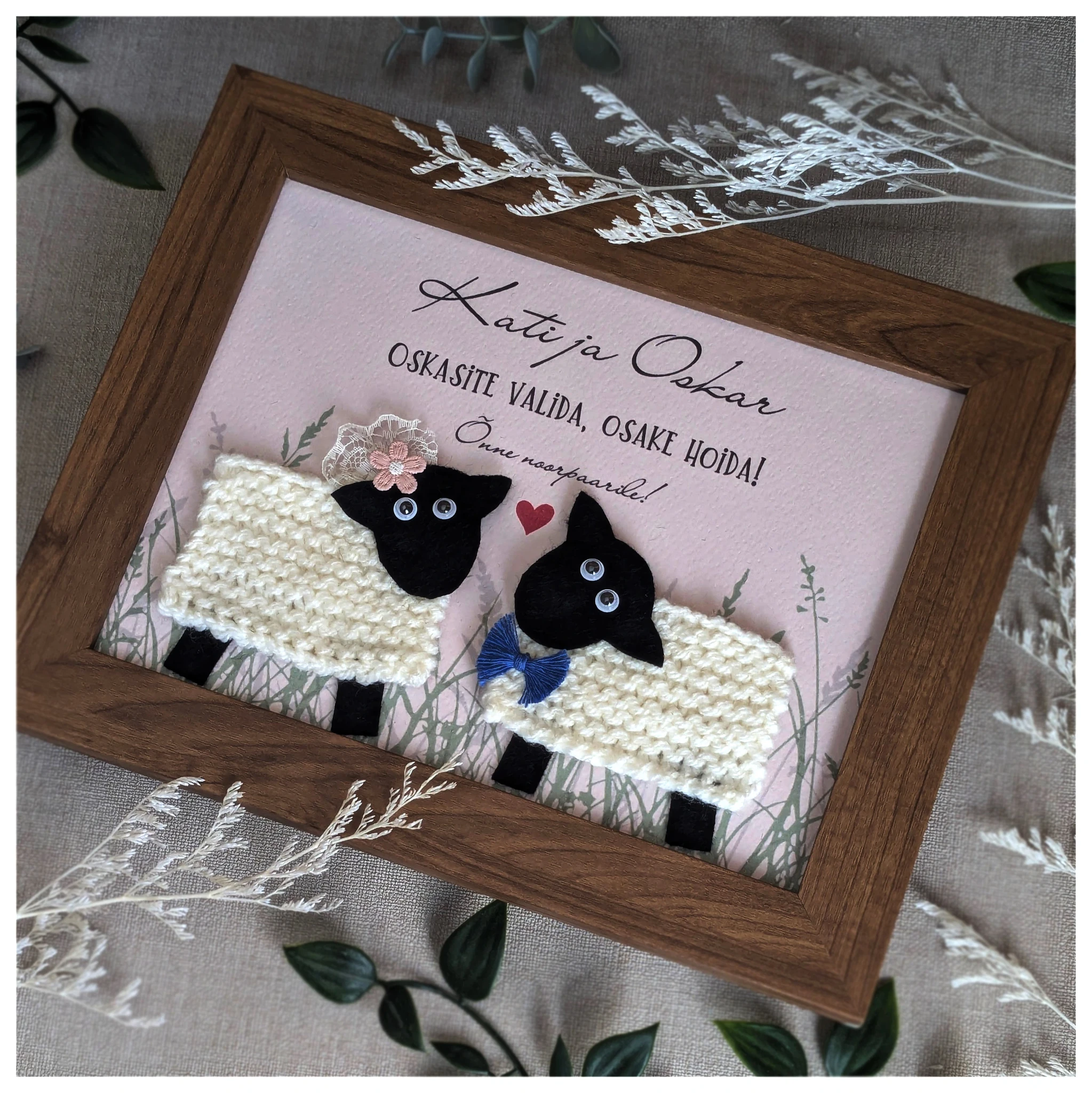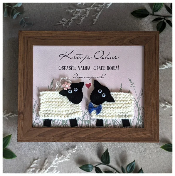 Raamitud humoorikas kingitus värsketele abiellujatele või pulma-aastapäeva tähistavale paarile. Kujunduses on kasutatud käsitsi valmistatud kootud lambakesi, mis sümboliseerivad ühtehoidmist, hoolimist ja koos kasvamist – ning meenutavad muigega, et ka parimas kooselus tuleb vahel lihtsalt rahulikult “ühes karjas” hoida.