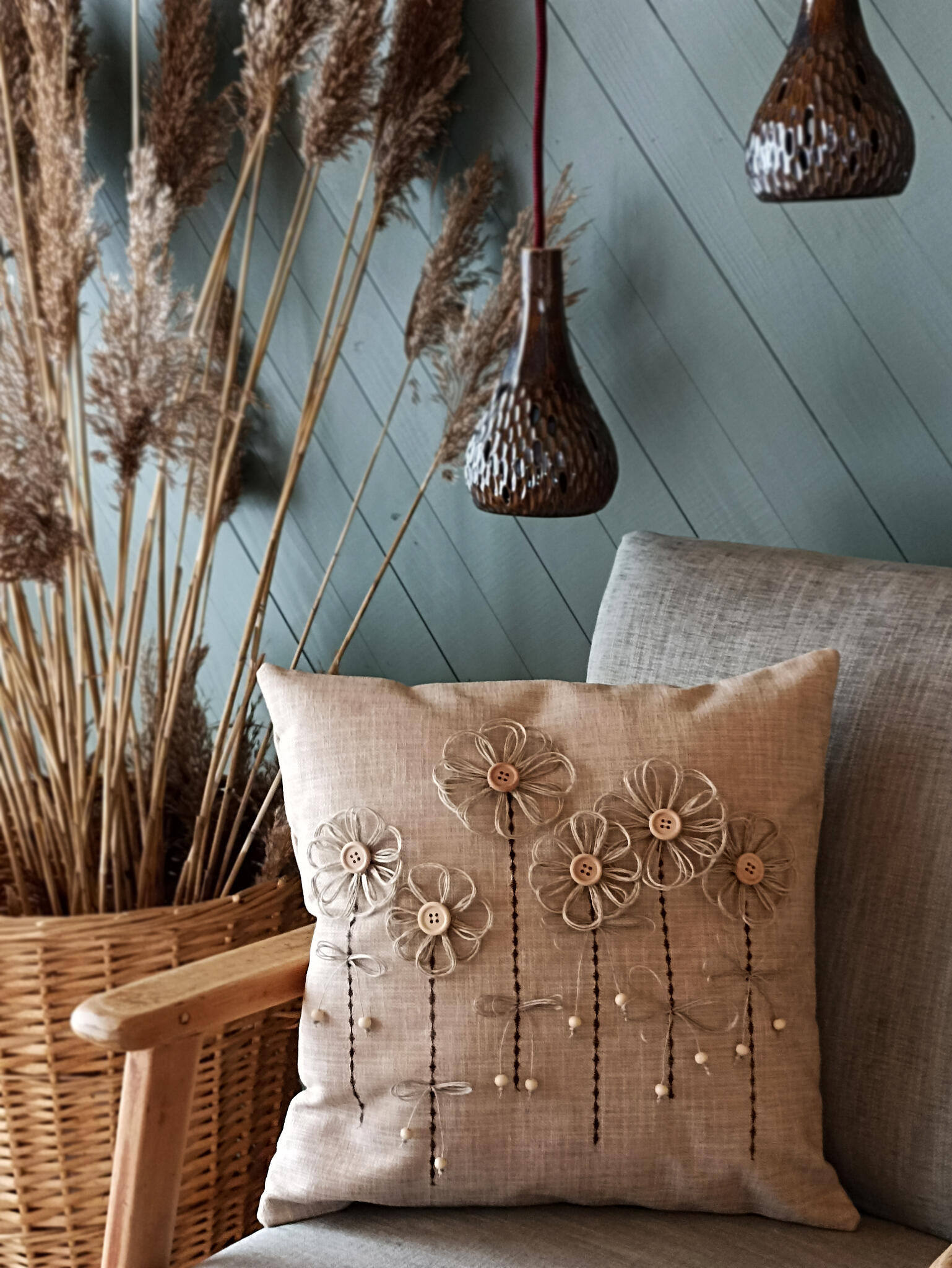 Padja suurus on 40x40cm. Padi on valmistatud puuvillast, lilled on tehtud linase nööriga. Padjatäide on polüestrist.