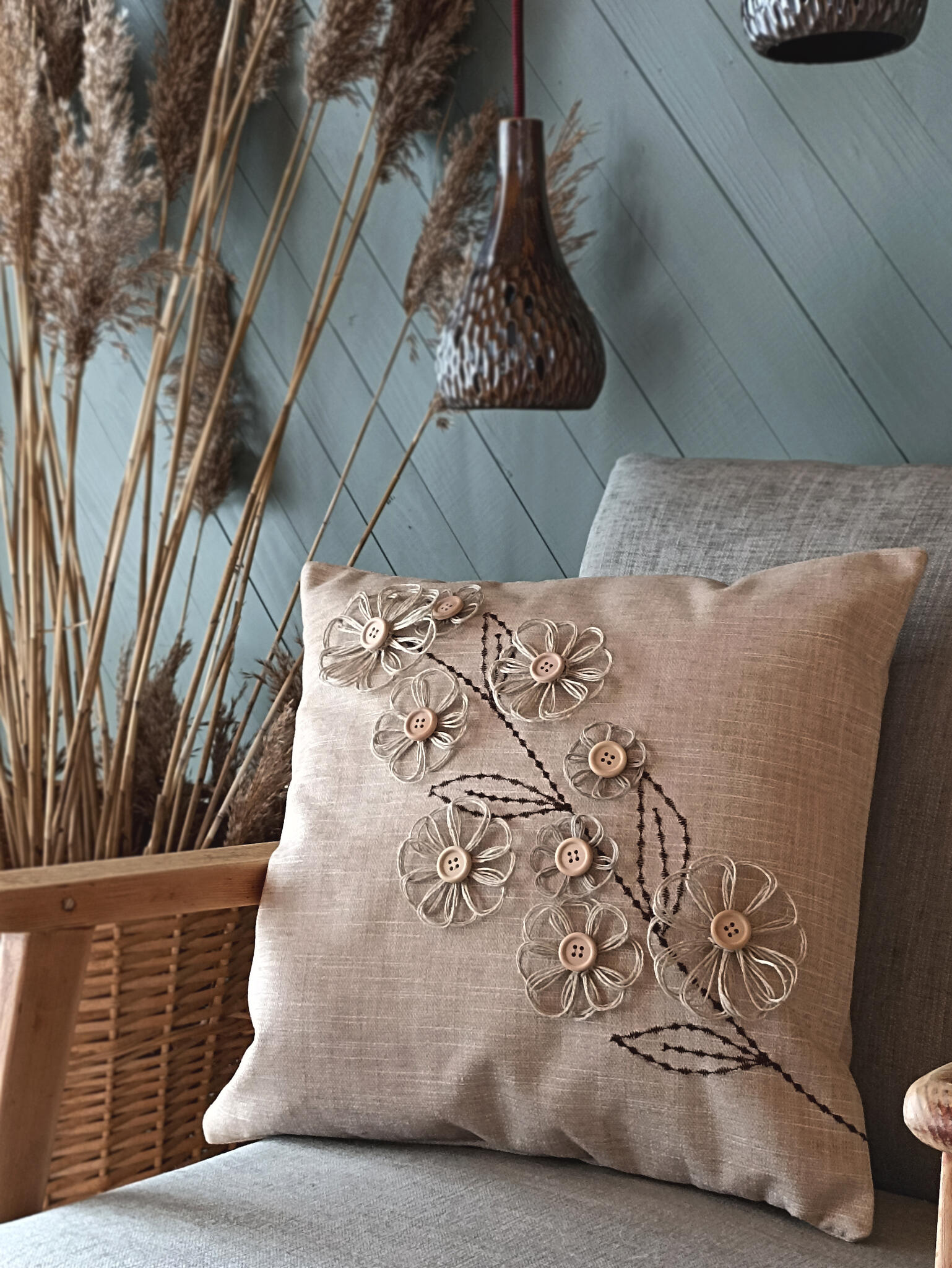 Padja suurus on 40x40cm. Padi on valmistatud puuvillast, lilled on tehtud linase nööriga. Padjatäide on polüestrist.