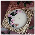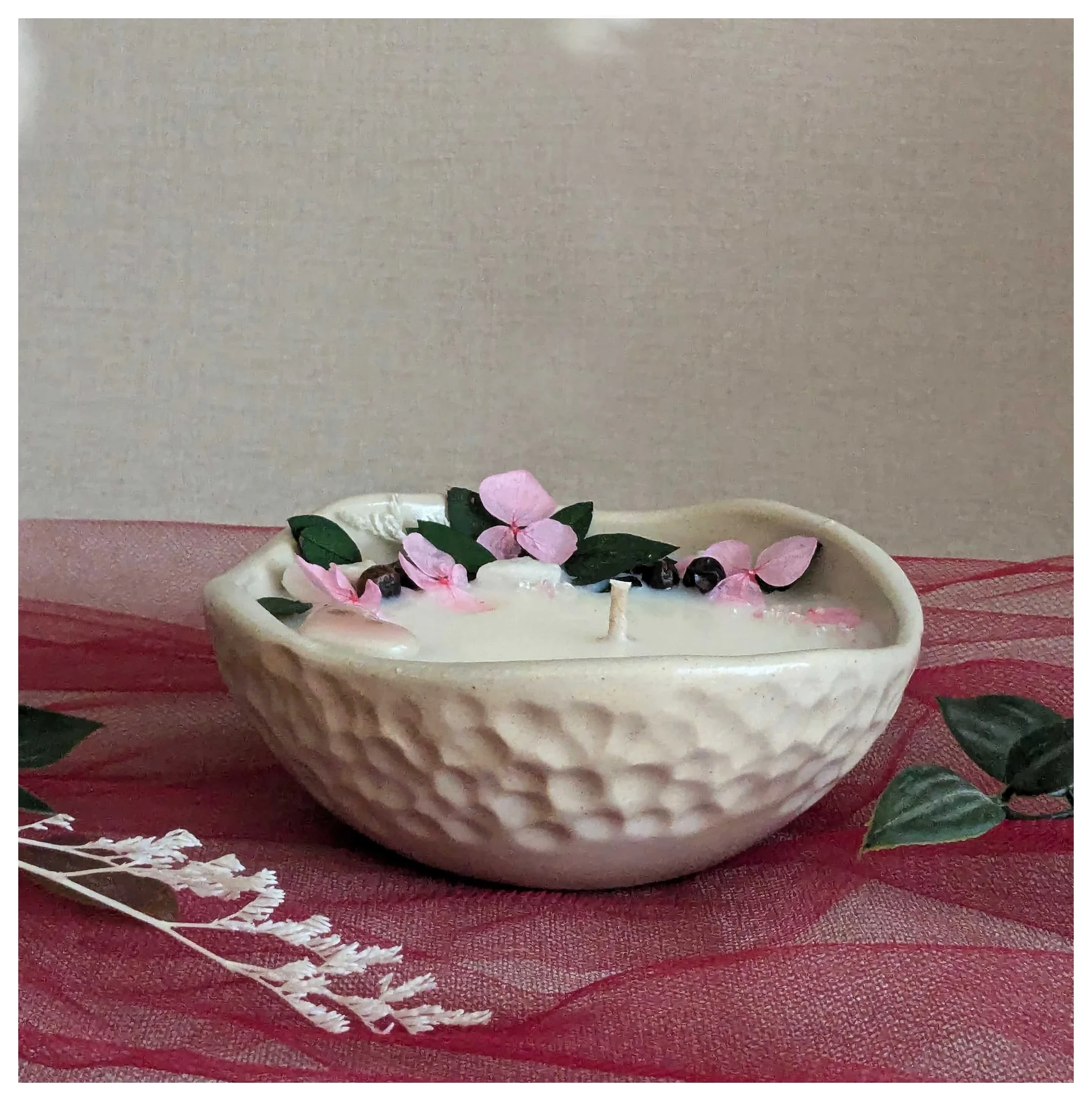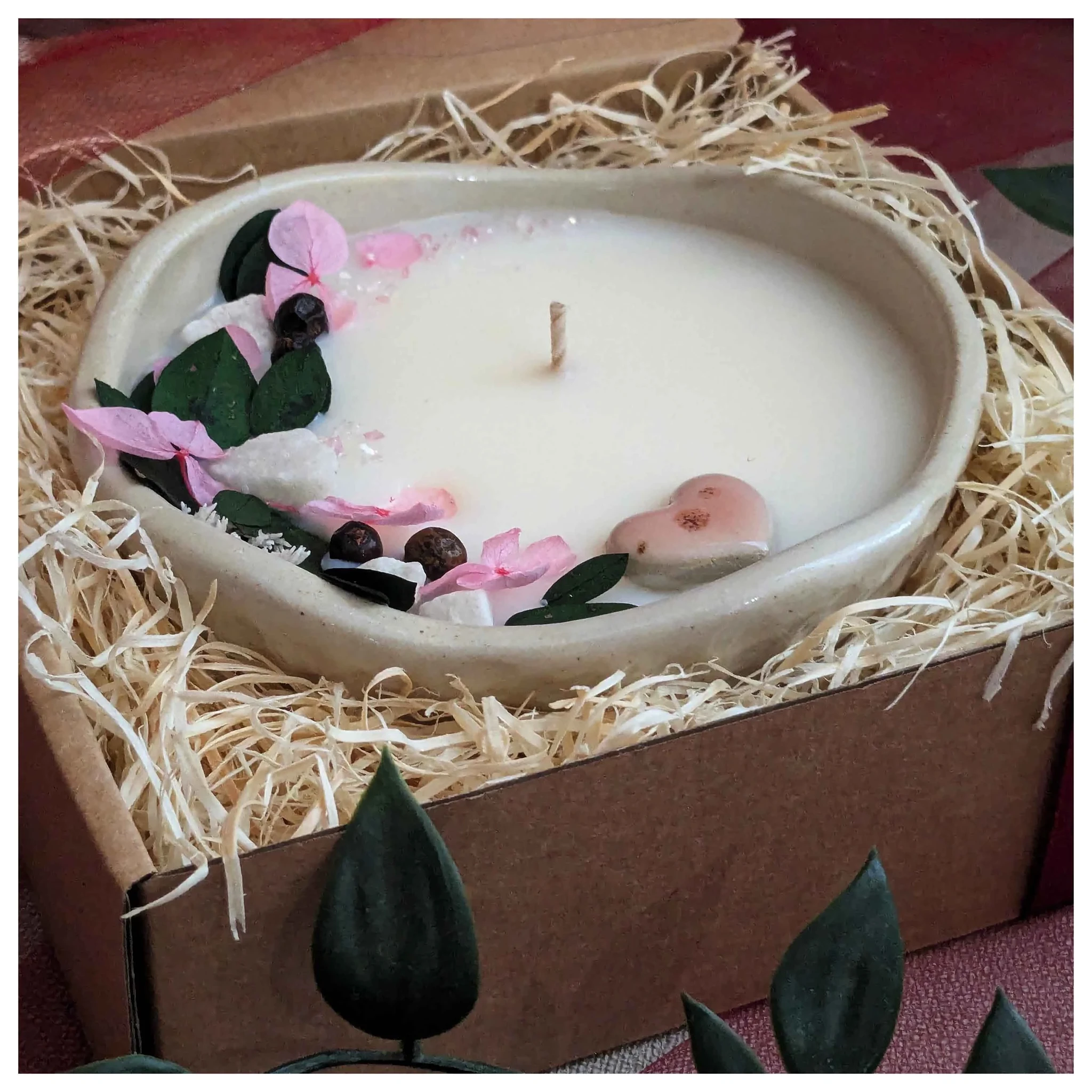 Käsitööküünal on valmistatud sojavahast, mis ei sisalda lõhna- ega värvaineid. Puhas ja looduslik küünal on hubases heledas keraamilises kausis, mis on valminud meie stuudios. Küünalt kaunistavad looduslikud lehed ja kivikesed, hortensia õied ja keraamiline süda. Küünlal on üks taht.