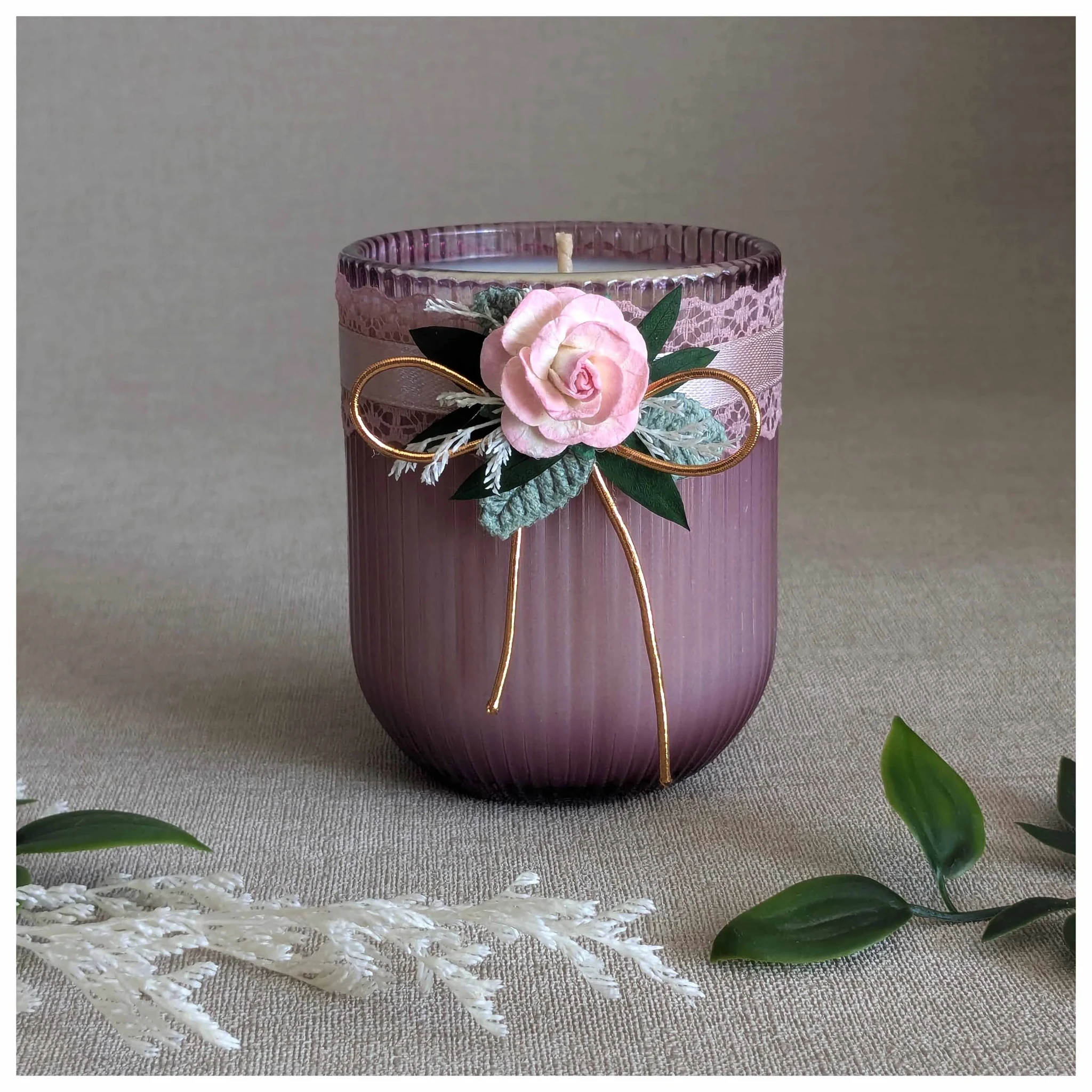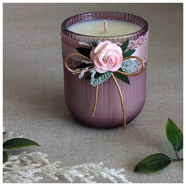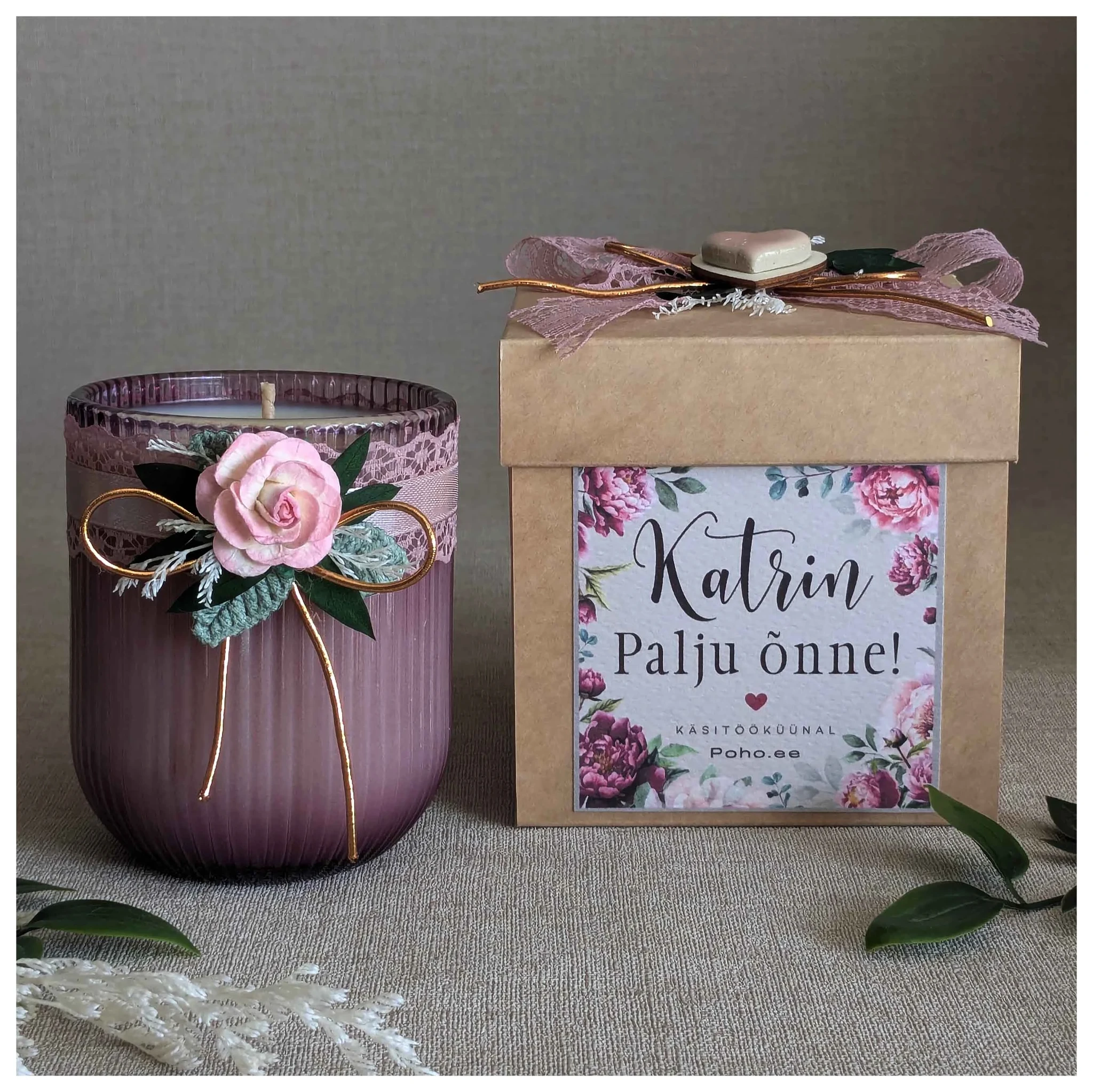 Naturaalne sojavaha küünal on valatud lillaka tooniga klaasi ning kaunistuseks on paelad, mooruspuu paberist lill, tekstiilist lehed ja stabiliseeritud eukalüpti lehed, mis loovad pehme ja naturaalse ilme. Küünal on pakitud kaanega kinkekarpi.Toote info: